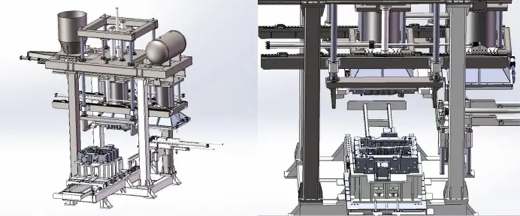Вход нижней части плесени → Закрытие плесени [давление вниз] → Вход в комбинированный модуль [модуль нажатия ядра] → Ввод головки впрыскивания песка → Верхняя головка впрыскивания песка → Инъекция песка → Верхняя головка песка. Выхлоп → Повышение головки впрыскивания песка → ВЫКЛЮЧЕНИЕ ВЫКЛЮЧЕНИЯ ПЕСЧА